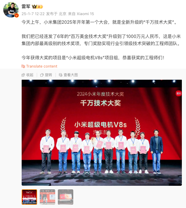 1月7日,小米董事长兼CEO雷军在社交平台发文宣布,将已经连发了6年的“百万美金技术大奖”升级到了1000万元人民币,这是小米集团内部最高级别的技术奖项。今年获得大奖的项目是“小米超级电机V8s”项目组。